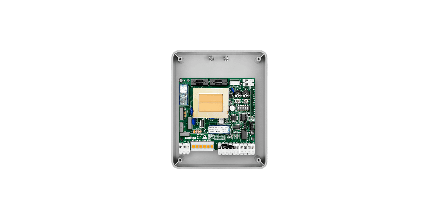 Parameter and operation logic regulations through trimmers and dip-switches | Integrated 433.92 MHz 64-code radio receiver with 3 encoding systems (Advanced Rolling Code, Rolling Code, Fixed Code) | Removable terminal boards | Automatic, semi-automatic and deadman’s logic | Encoder (MAG.E) input for detecting obstacles | Motor limit switch inputs | Step by step, stop and photocell inputs | Step by step input configurable as open | Stop input configurable as close or pedestrian | Photocell input programmable as active in opening-closing and in closing phases | Output as gate open indicator | Autosetting of operation and slow-down parameters | Adjustable slow-downs | Electronic torque adjustment for motor on 5 levels | Possibility to manage radio transmitters memorised on integrated receiver with Advantouch system